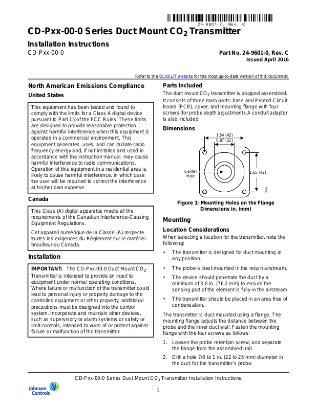 EuropeCE Mark – Johnson Controls, Inc. declares that the CD-Pxx-00-0 Duct Mount CO2