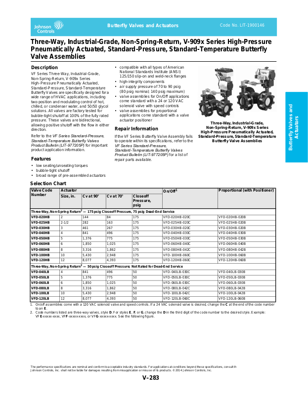1. Refer to the VF Series Standard-Pressure, Standard-Temperature Butterfly Valves Product Bulletin (LIT-977205P) for actuator specifications.