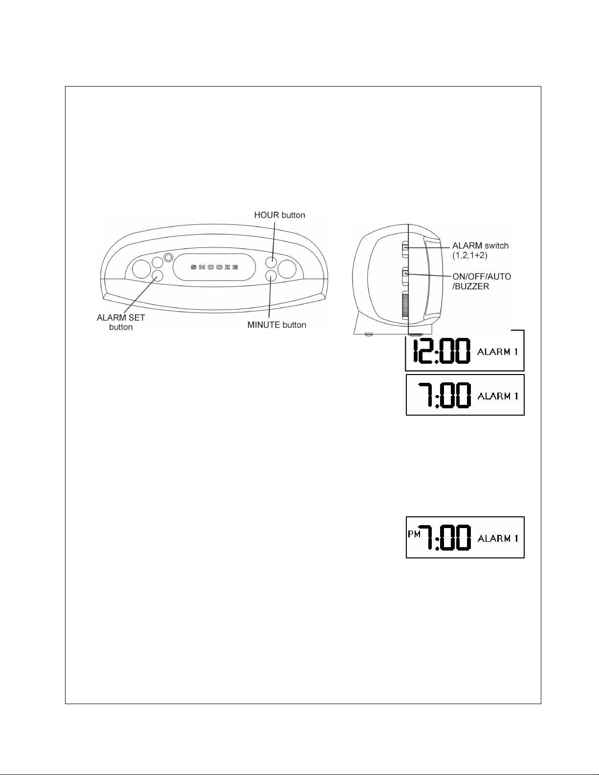 HOUR = Bouton des HEURES / ALARM SET = Bouton de REGLAGE DE L’ALARME / LARGE LCD