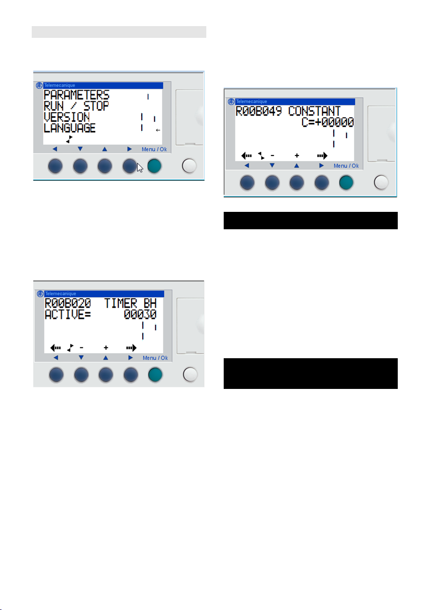 меню PARAMETERS (слово PARAMETERS будет мигать) и под­твердить с помощью кнопки Меню/ Ок. Программируемый контроллер перейдет в режим STOP. Откроется окно с отображением первого пара­метра.