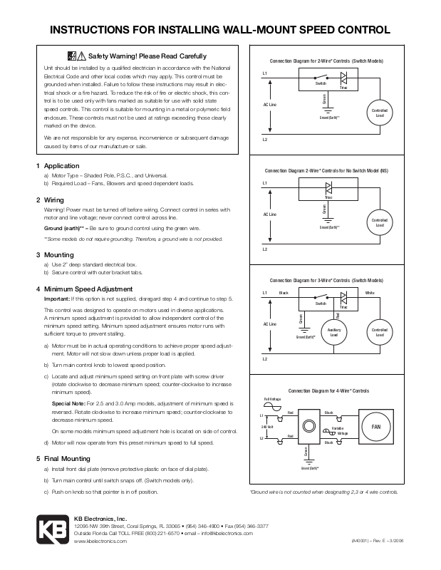 INSTRUCTIONS FOR INSTALLING WALL-MOUNT SPEED CONTROL