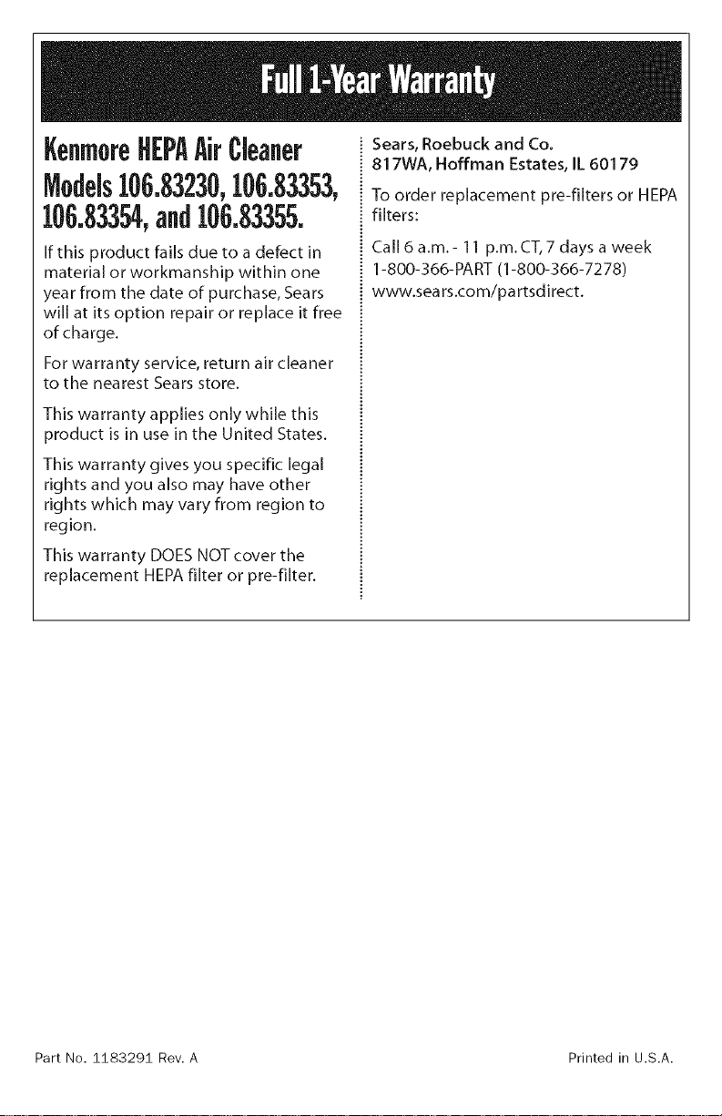 Sears,Roebuck and Co.,Hoffman Estates,lL 60179 U.S.A. Part No. 1183291 Rev.A