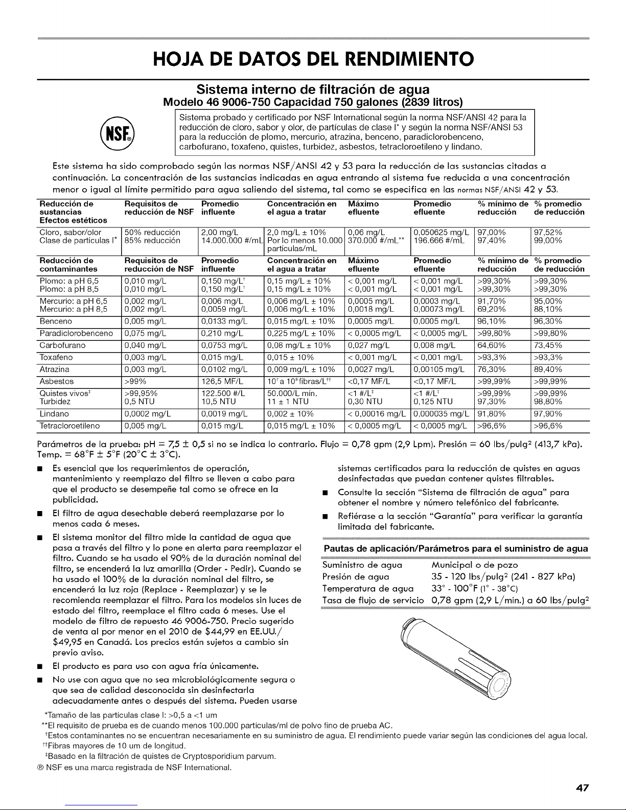 Param&tres de test ."pH : 7,5 4- 0,5 6 moins d'indications contraires. D&bit : 0,78 gpm (2,9 Lpm). Pression : 60 Ib/po 2 (413,7 kPa).