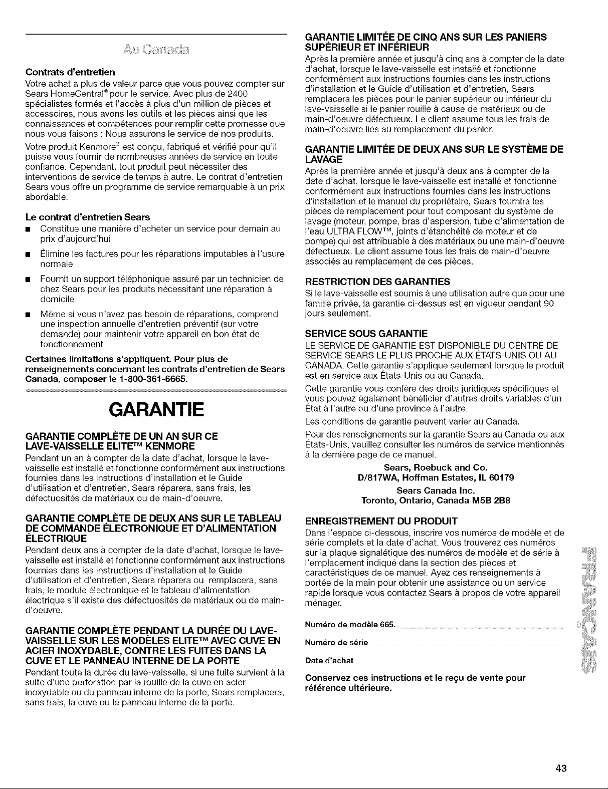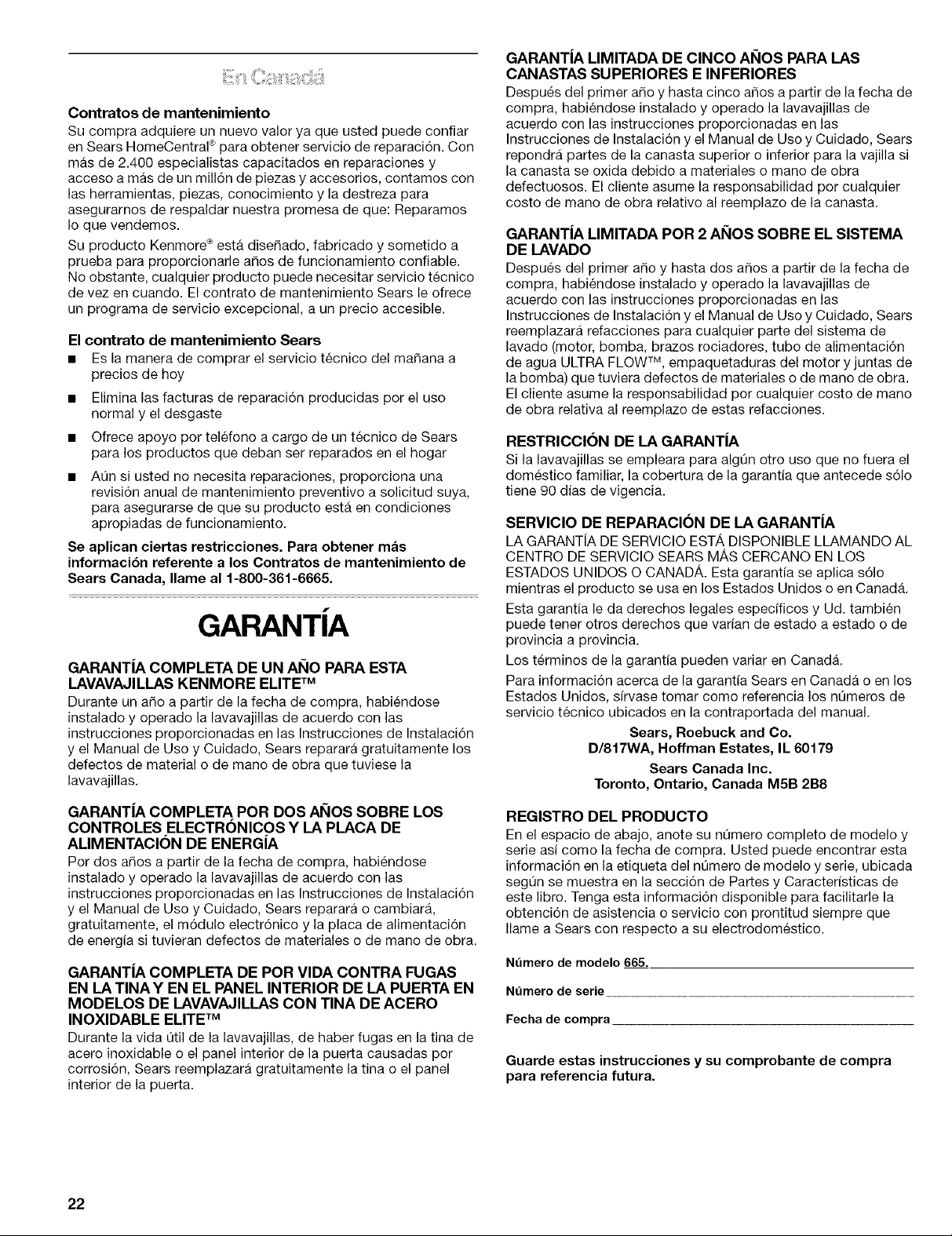 Warranty terms may vary in Canada. For Sears Warranty information in the United States or Canada,