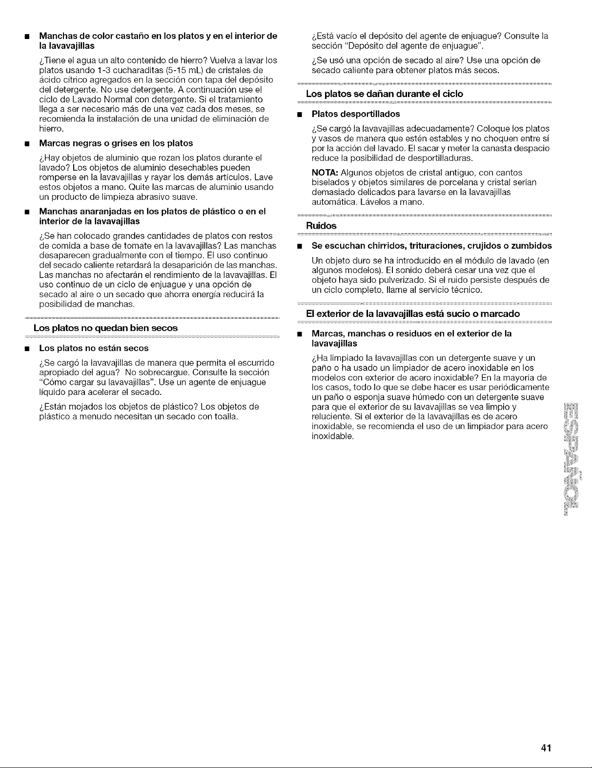 drainage adequat de I'eau? Ne pas charger excessivement. Voir la section "Chargement du lave-vaisselle". Utiliser un agent de rint_age liquide pour accelerer le sechage.