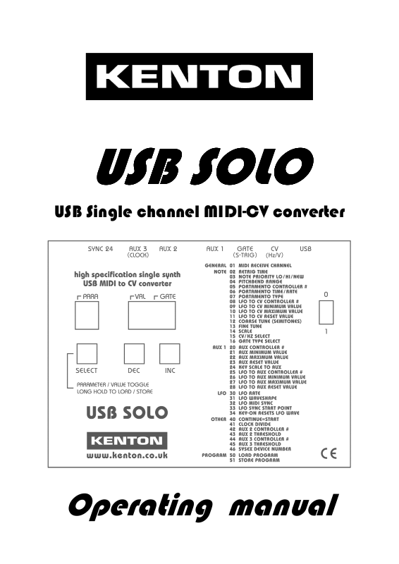 When the USB SOLO is switched on, the words KENTON USB SOLO scroll across the display, and