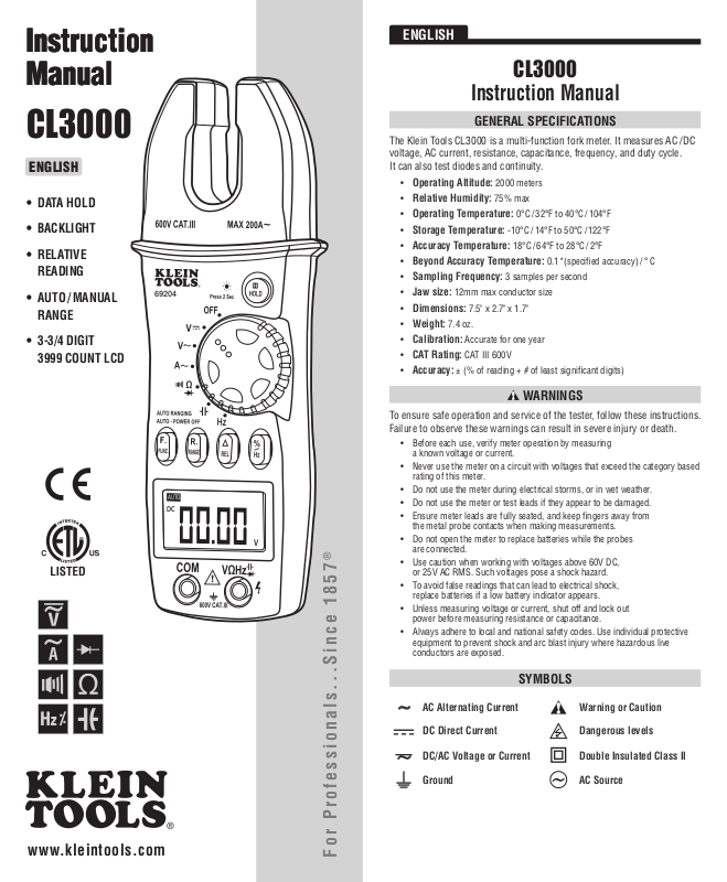 The Klein Tools CL3000 is a multi-function fork meter. It measures AC / DC
