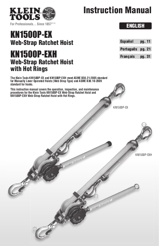 This instruction manual covers the operation, inspection, and maintenance procedures for the Klein Tools KN1500P-EX Web-Strap Ratchet Hoist and KN1500P-EXH Web-Strap Ratchet Hoist with Hot Rings.