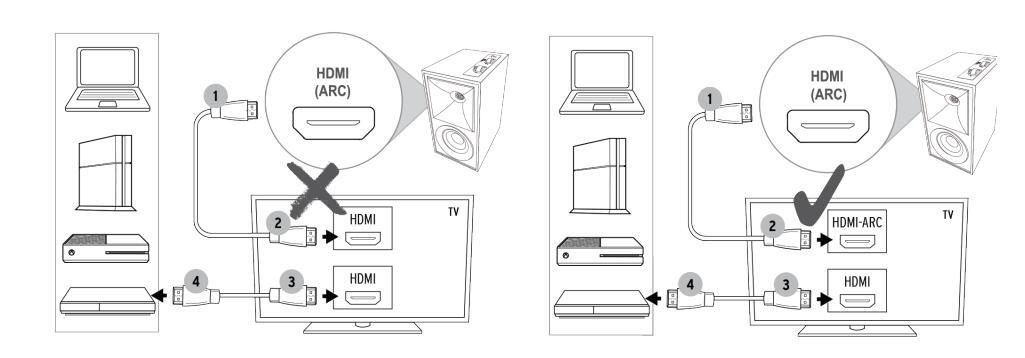Podstawowe wejście HDMI telewizora nie przeniesie sygnału audio telewizora do głośników. Aby odbierać TV Audio należy podłączyć The Fives do wyjścia HDMI ARC, optycznego lub analogowego audio telewizora.