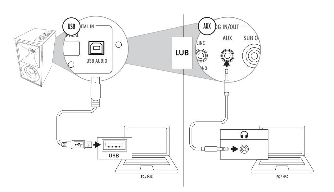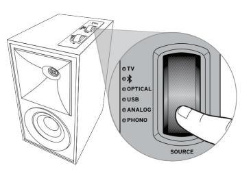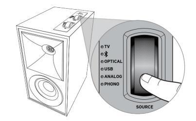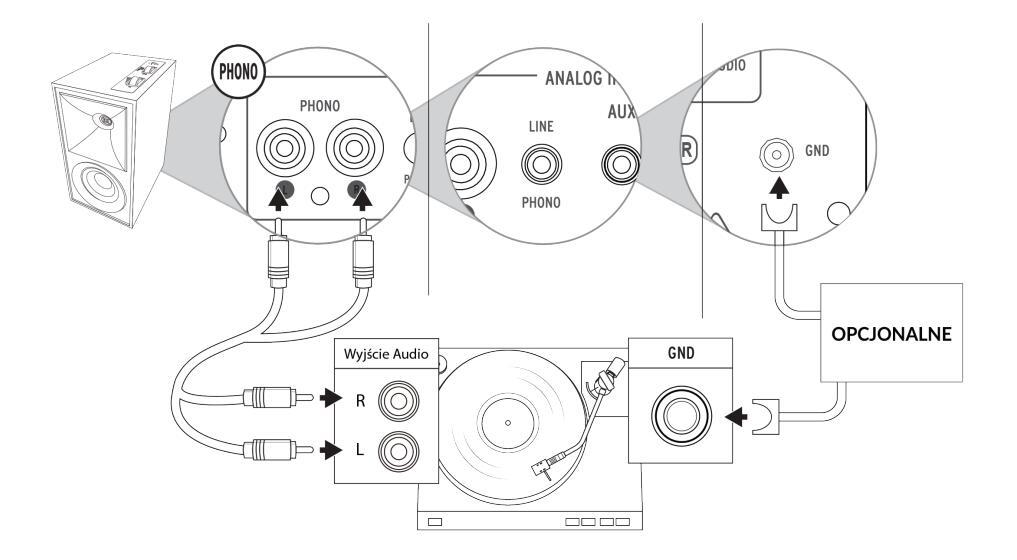 Kontrola źródła/ Wskaźnik źródła LED Kontrola głośności Weiście phono Przełącznik Phono / Line Gniazdo AUX 3.5 mm Wyjście na subwoofer