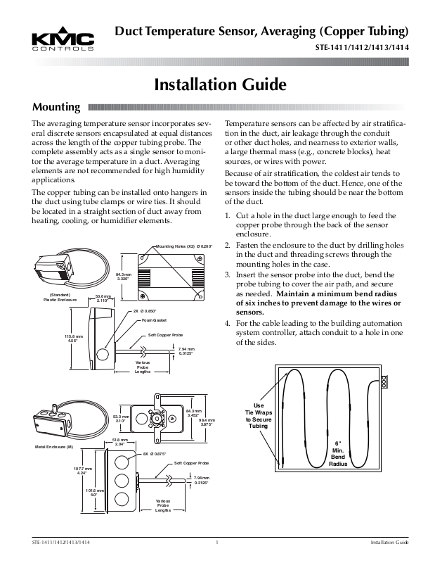 complete assembly acts as a single sensor to monitor the average temperature in a duct. Averaging