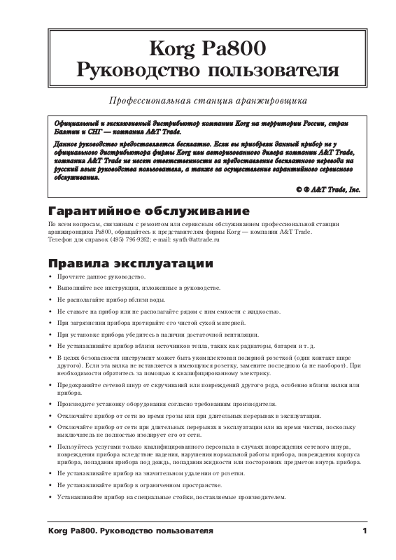 аранжировщика Pa800, обращайтесь к представителям фирмы Korg — компании A&T Trade.