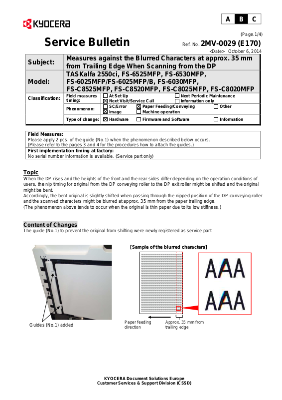 The guide (No.1) to prevent the original from shifting were newly registered as service part.