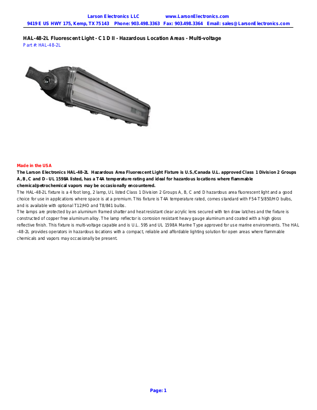 The HAL-48-2L fixture is a 4 foot long, 2 lamp, UL listed Class 1 Division 2 Groups A, B, C and D hazardous area fluorescent light and a good
