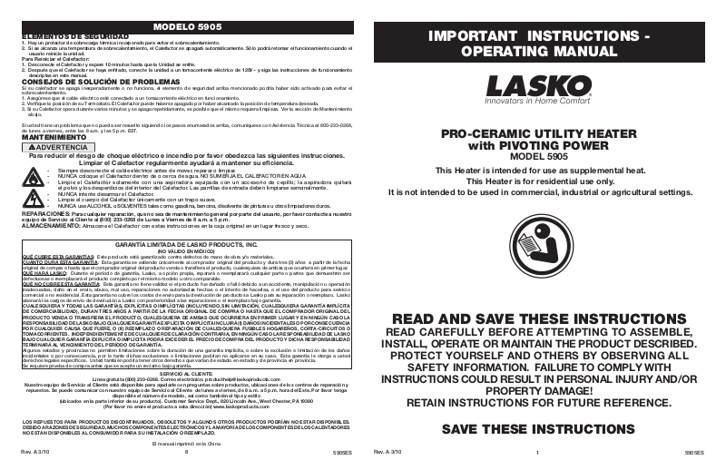 comercial o no residencial. Esta garantía no cubre los costos de envío para la devolución de productos a Lasko para su reparación o reemplazo. Lasko