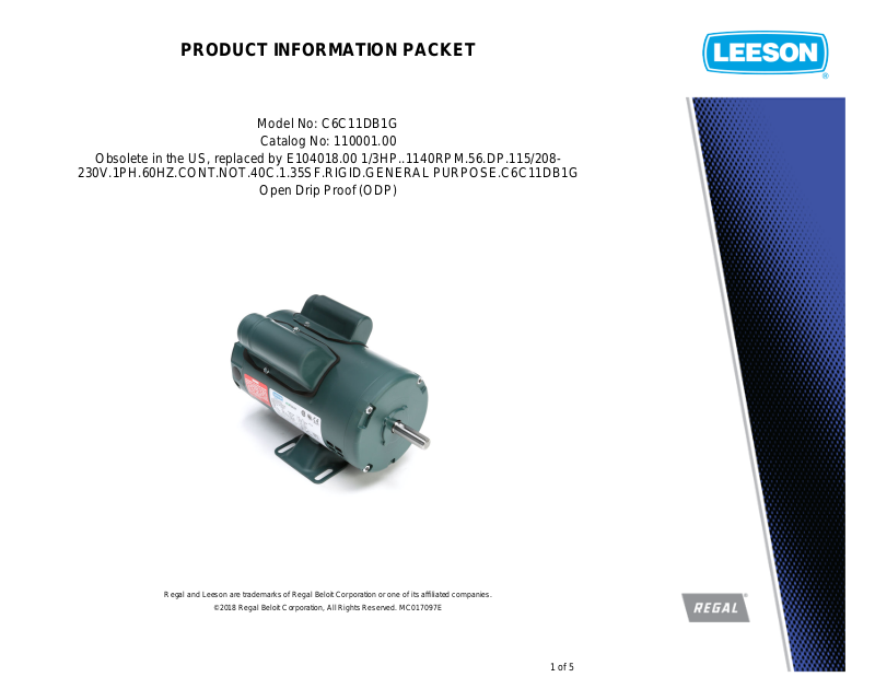 Product Information Packet: Model No: C6C11DB1G, Catalog No:110001.00 Obsolete in the US, replaced by E104018.00 1/3HP..1140RPM.56.DP.115/208-230V.1PH.60HZ.CONT.NOT.40C.1.35SF.RIGID.GENERAL PURPOSE.C6C11DB1G