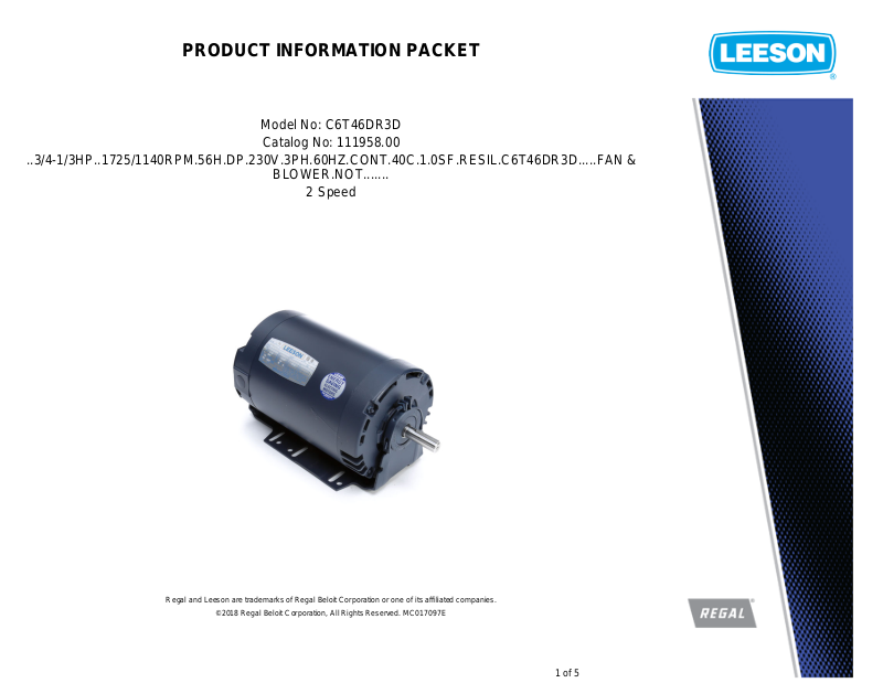 Leeson 111958.00 PRODUCT INFORMATION PACKET
