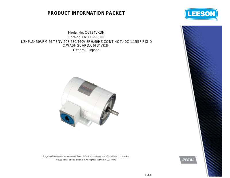 Product Information Packet: Model No: C6T34VK3H, Catalog No:113588.00 1/2HP..3450RPM.56.TENV.208230/460V.3PH.60HZ.CONT.NOT.40C.1.15SF.RIGID C.WASHGUARD.C6T34VK3H