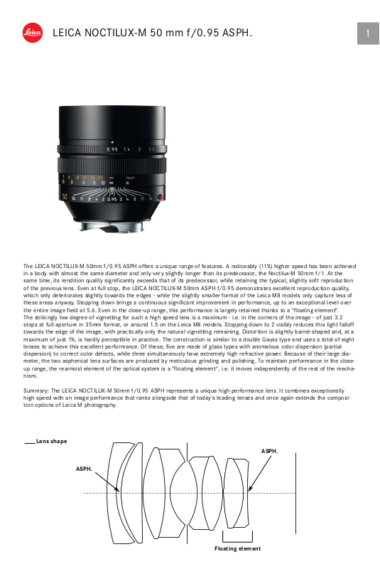 Summary: The LEICA NOCTILUX-M 50mm f/0.95 ASPH represents a unique high performance lens. It combines exceptionally