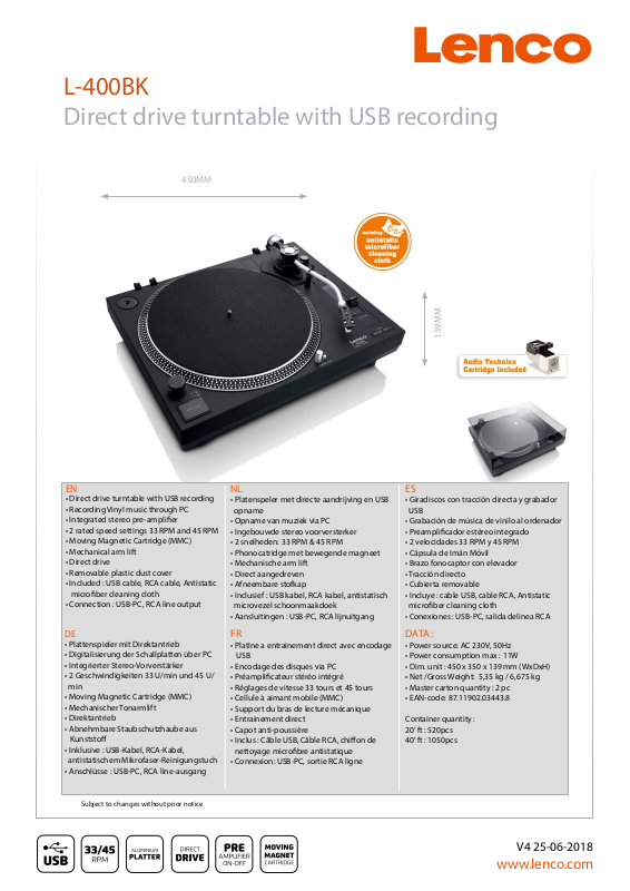• Inclusief : USB kabel, RCA kabel, antistatisch