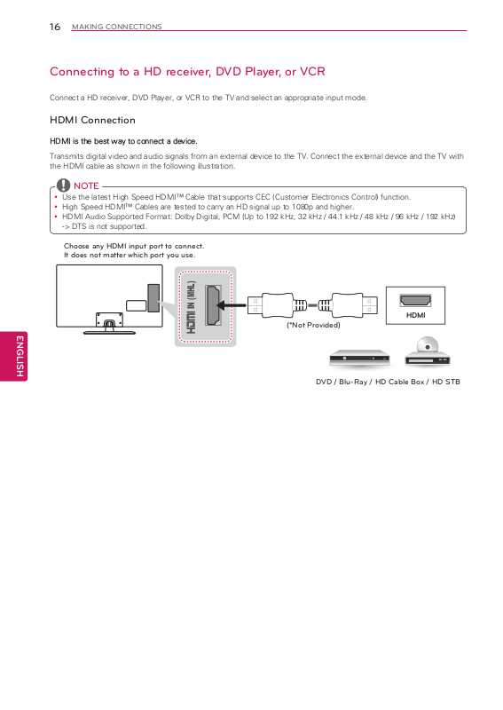 Transmits digital video and audio signals from an external device to the TV. Connect the external device and the TV with