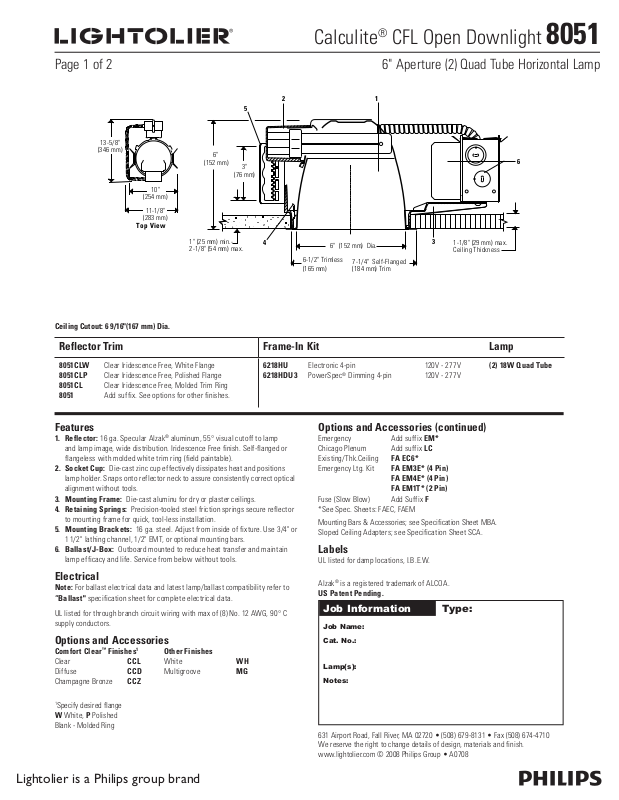 1. Reflector: 16 ga. Specular Alzak® aluminum, 55° visual cutoff to lamp