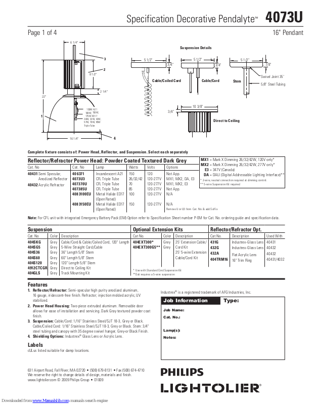 Note: For CFL unit with integrated Emergency Battery Pack (EM) Option refer to Specification Sheet number P-EM for Cat. No. ordering guide and specification data.