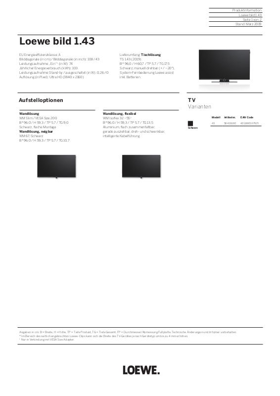 * Im Bereich des seitlich angebrachten Loewe-Clips kann sich die Breite des TV-Gerätes je nach Gerätetyp um bis zu 4 mm erhöhen.