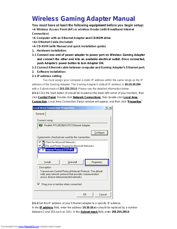 2-1-2 Set the IP address of your Ethernet adapter to a specific IP address.