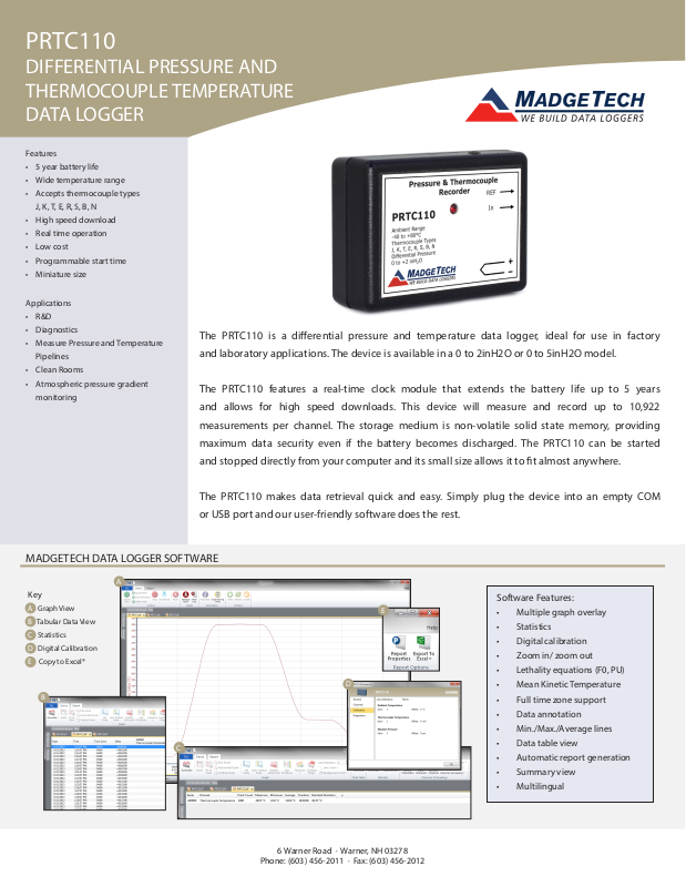 The PRTC110 is a dierential pressure and temperature data logger, ideal for use in factory
