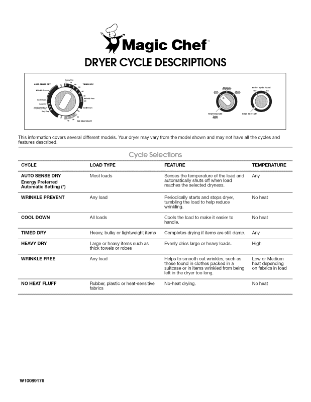 This information covers several different models. Your dryer may vary from the model shown and may not have all the cycles and