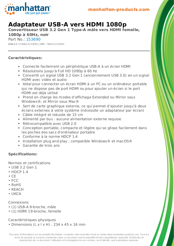 Pour plus d'informations sur les produits Manhattan, contactez votre revendeur local ou visitez www.manhattan-products.com. Tous les