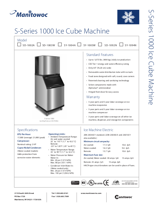 “Ai r” or “Water” condensing unit. Ice storage bin and JC-0895A remote condenser