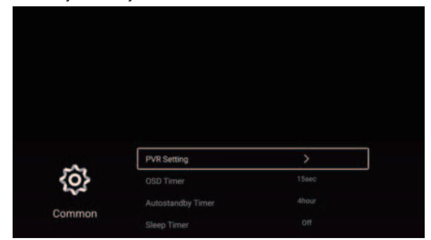 Naciśnij przyciski nawigacji aby wybrać PVR Ustawienia. Naciśnij przyciski nawigacji aby wybrać Wybierz dysk/Format/Prędkość/Lista rekordów/Lista Naciśnij OK aby wejść do sub menu.