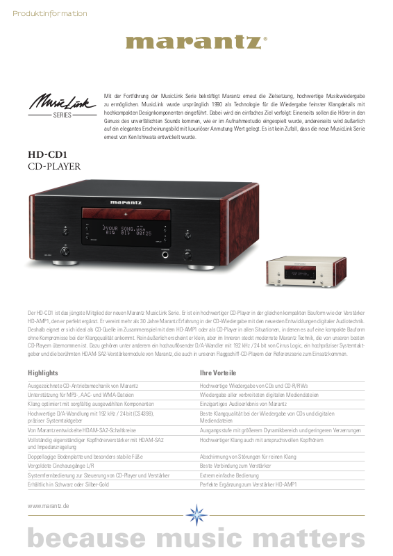 HD-AMP1, den er perfekt ergänzt. Er vereint mehr als 30 Jahre Marantz Erfahrung in der CD-Wiedergabe mit den neuesten Entwicklungen digitaler Audiotechnik.