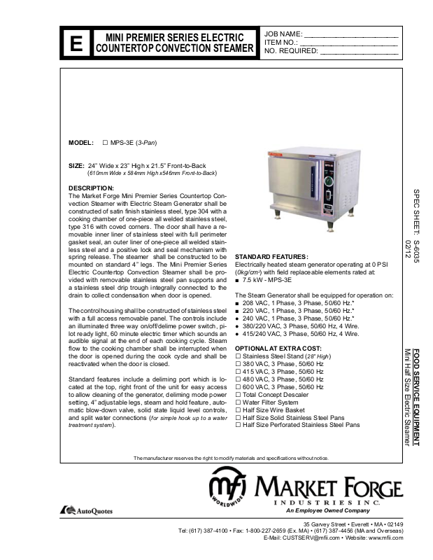 The Market Forge Mini Premier Series Countertop Convection Steamer with Electric Steam Generator shall be