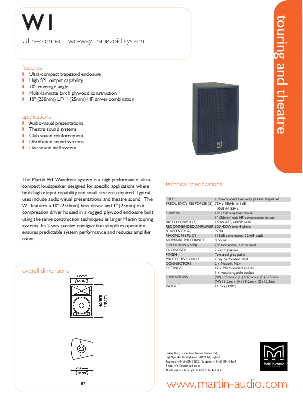 The Martin W1 Wavefront system is a high performance, ultracompact loudspeaker designed for specific applications where