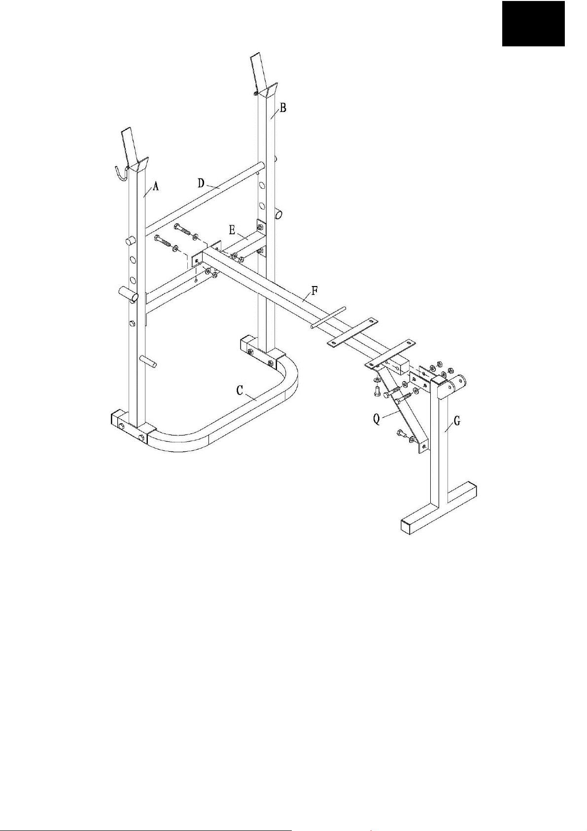 Befestigen Sie die diagonale Stütze (Q) an der Hauptstange (F) und der vorderen Stange (G) mit Schrauben