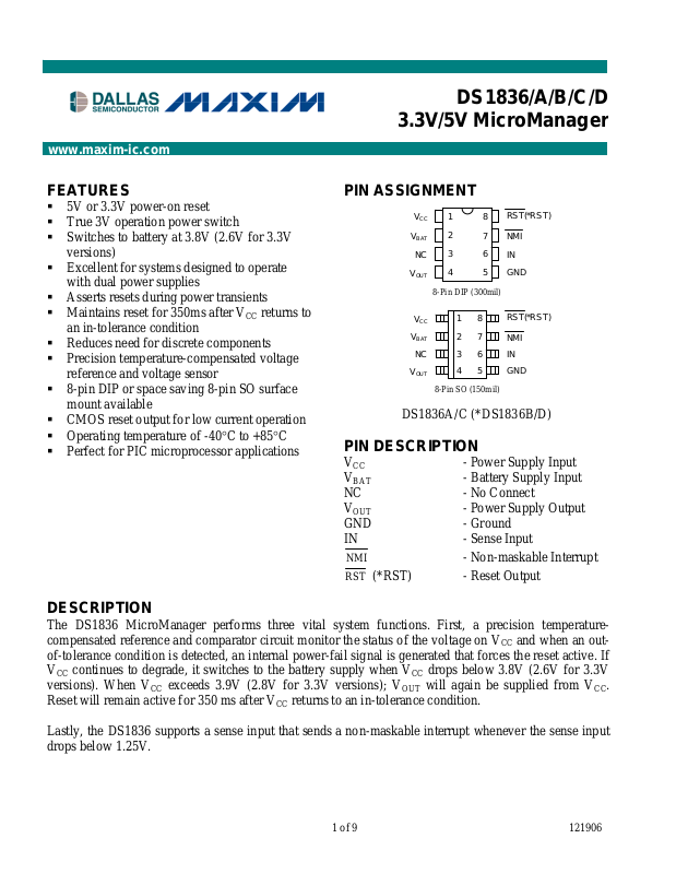 The DS1836 MicroManager performs three vital system functions. First, a precision temperaturecompensated reference and comparator circuit monitor the status of the voltage on VCC and when an outof-tolerance condition is detected, an internal power-fail signal is generated that forces the reset active. If