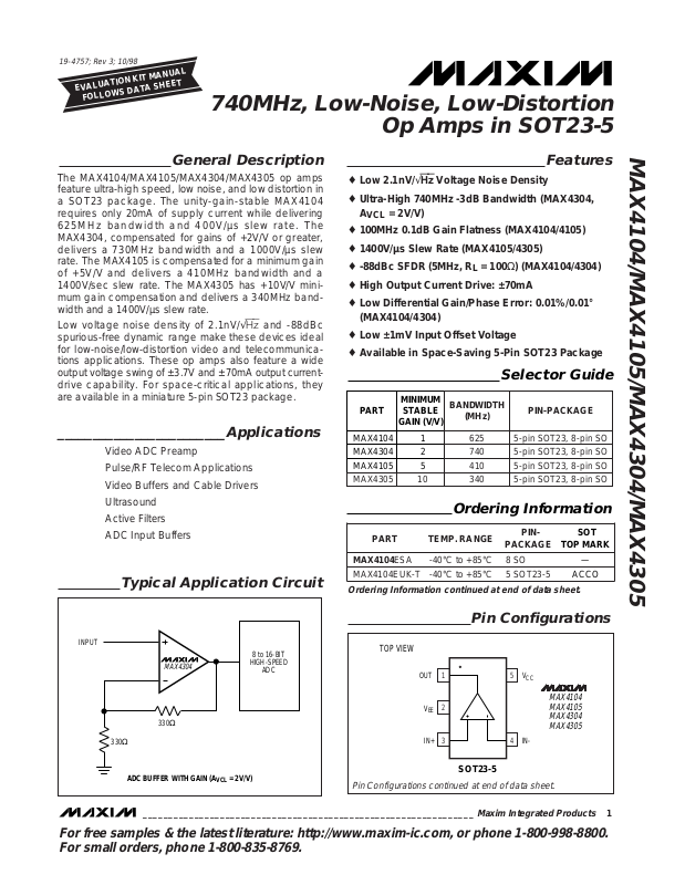 The MAX4104/MAX4105/MAX4304/MAX4305 are ultrahigh-speed, low-noise amplifiers featuring -3dB bandwidths up to 880MHz, 0.1dB gain flatness up to