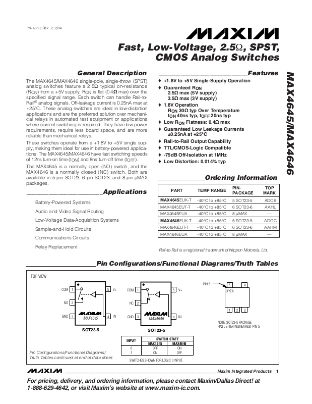 Fast, Low-Voltage, 2.5Ω, SPST,