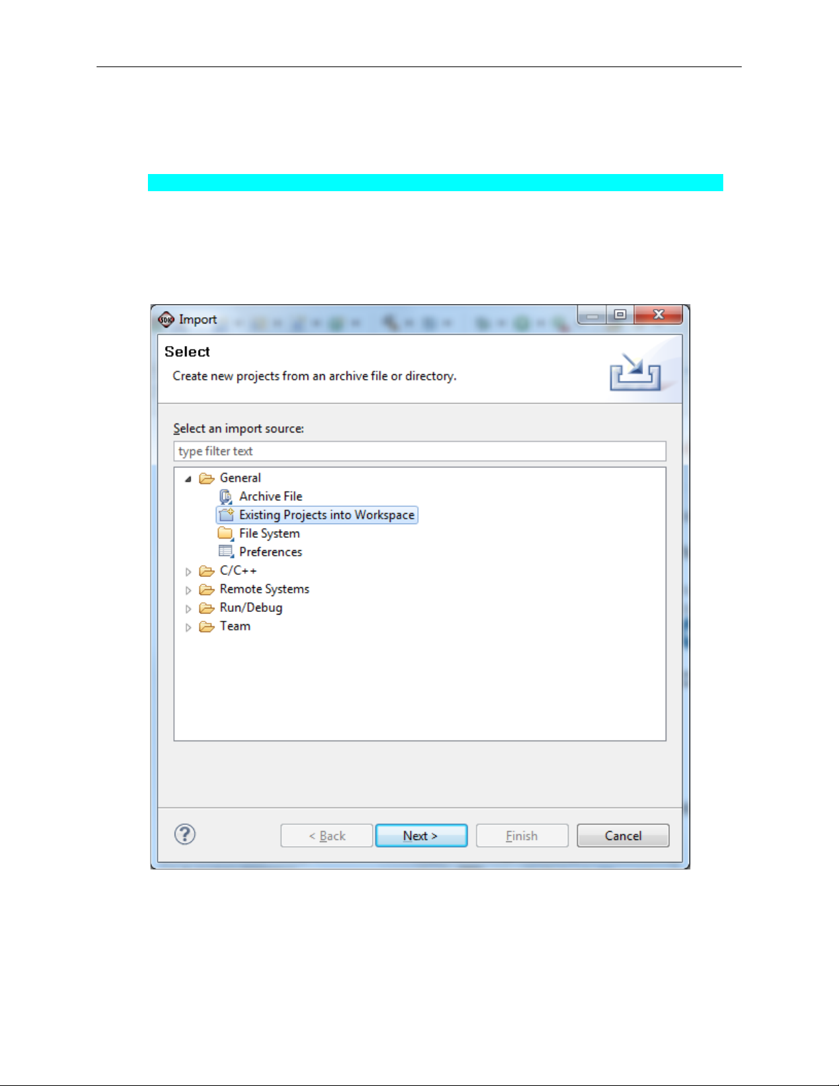File | Import menu, expand the General folder, and select Existing Projects