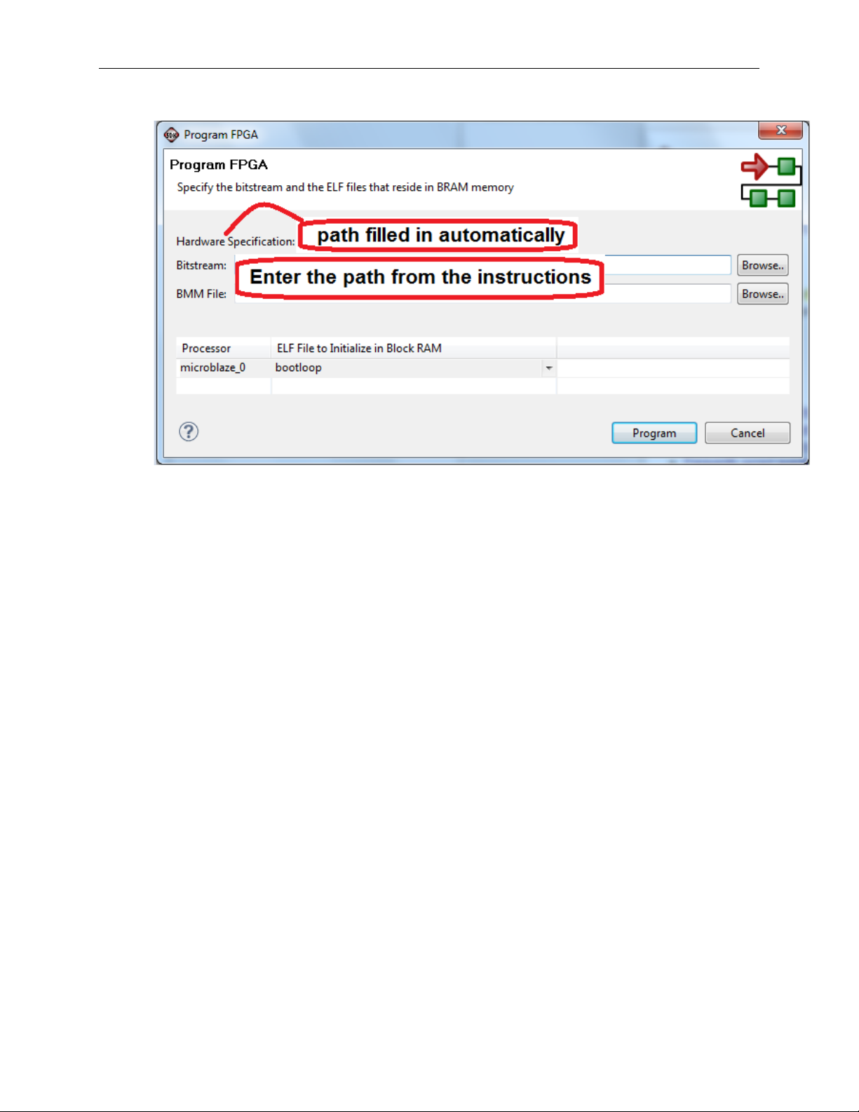file is selected as well as an FPGA BMM (.BMM) file. Be sure to select the .BIT
