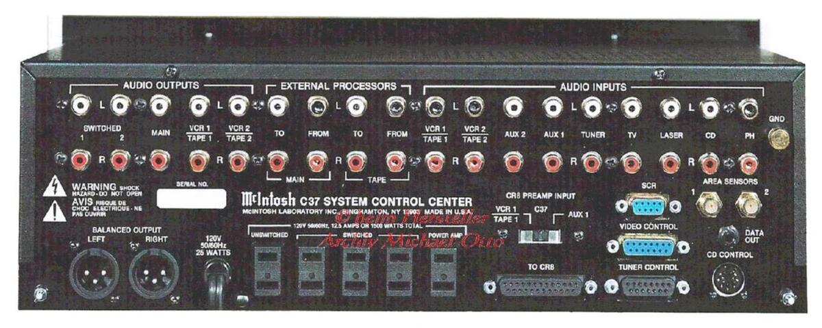 The C37 includes gold plated audio input connectors for a phonograph, a CD player, two tape recorders (audio or video), a tuner, two auxiliary high level sources, a laser disc player, and a television set or monitor. There are two independent processor loops, one affecting the tape circuits, and the other the main outputs. Through these loops you can connect separate equalizers, surround sound decoders, reverberation processors, and other ancillary equipment.