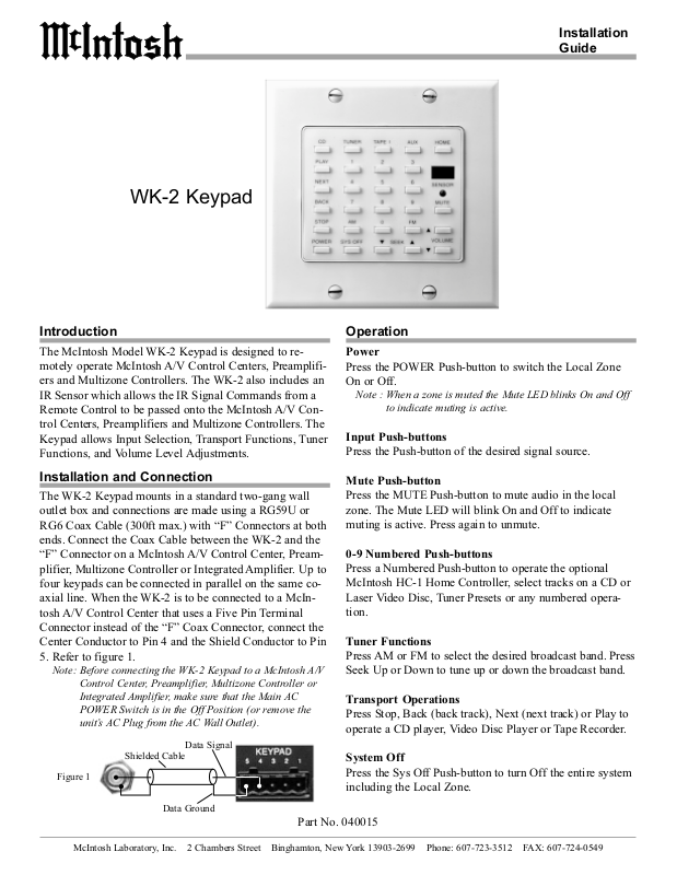 Note: Before connecting the WK-2 Keypad to a McIntosh A/V
