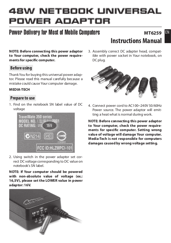 Media-Tech nie ponosi żadnej odpowiedzialności za uszkodzenia komputera spowodowane ustawieniem niewłaściwego napięcia