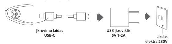 Svarbu. Prietaisas aprūpintas ličio jonų baterija. Jį reikia įkrauti bent kartą per 3 mėnesius, kad veiktų visas. Prieš pirmąjį naudojimą rekomenduojame visiškai įkrauti akumuliatorių.