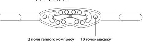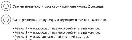 Jjunkite/išjunkite masažuoklį – palaikykite mygtuką 2 sekundes. Masažo režimų keitimas – vienas trumpas mygtuko paspaudimas. 1 režimas – Akių zonos masažas + šiltas kompresas 2 režimas – Akių zonos masažas + šiltas kompresas