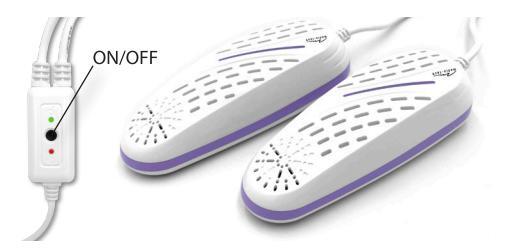 Boots Ozon Dryer 2 is very easy to use. Insert both parts of the device inside your shoes and connect the power cable. The red LED on the cable remote control is lit, which means that the device is powered.