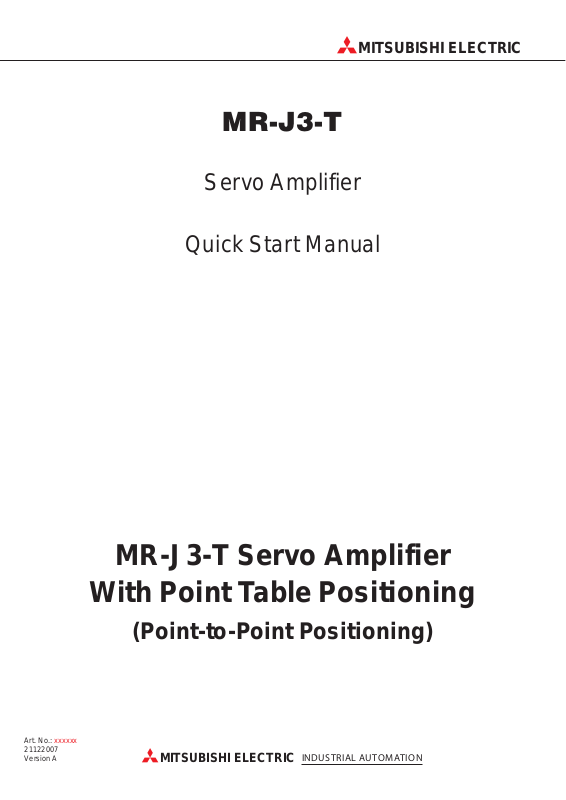This Quick Start Manual for the servo amplifiers of the MR-J3-T series with point table positio